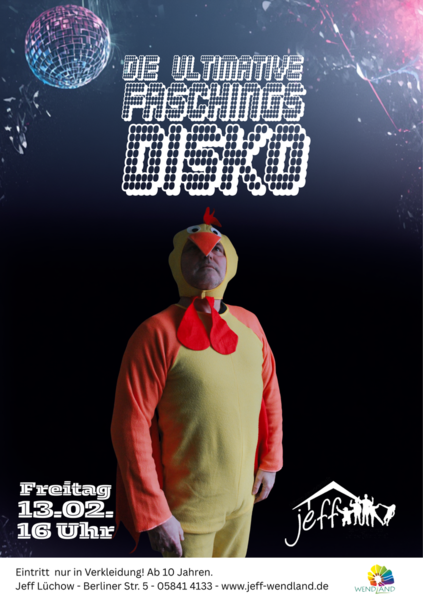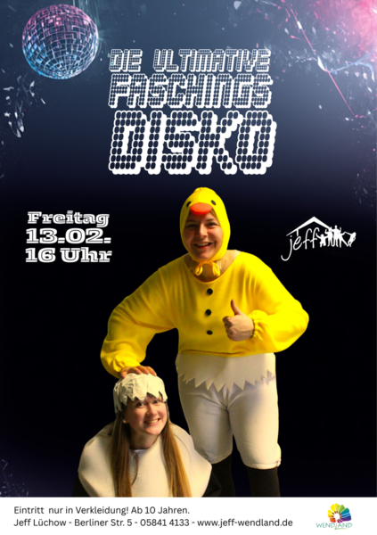 Am Freitag, den 13. Februar, feiern wir mit euch im Jeff Lüchow Fasching. Von 16:00 bis 18:30 Uhr gibt es Musik, Spiele und genug Zeit zum Tanzen. Eingeladen seid ihr alle ab 10 Jahren, der Eintritt ist frei und für Snacks und Getränke ist gesorgt. Achtung! Wir haben eine strikte Türpolitik: Reingelassen wird nur, wer verkleidet ist ;-)