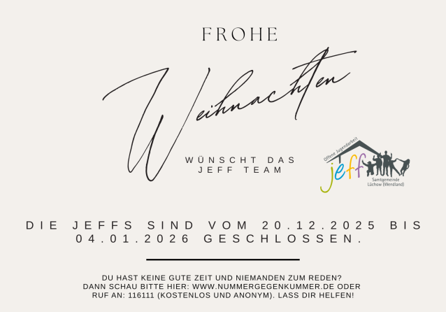 Die Jeffs sind ab dem 20.12.2025 bis zum 04.01.2026 geschlossen. Ab dem 05.01.2026 sind wir wieder für Dich da! Wir wünschen Dir und Euch eine schöne Weihnachtszeit und einen guten Start in das neue Jahr!!